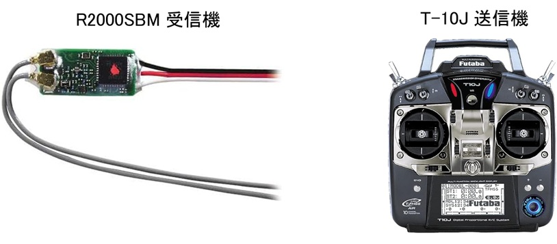 RC受信機には実績のある国内メーカの双葉電子工業製のものを採用することとし、送信機(T-10J)とセットで比較的低価格で販売されていた双葉製受信機の最小サイズのR2000SBMを購入しました。この受信機はフライトコントローラのUART(RX端子)に接続して、送信機からの8チャネルのRC制御信号をS.BUSプロトコルでフライトコントローラに送ります。無線の方式はS-FHSS 2.4GHzです。尚、T-10J送信機は10チャネルの信号を送ることができます。