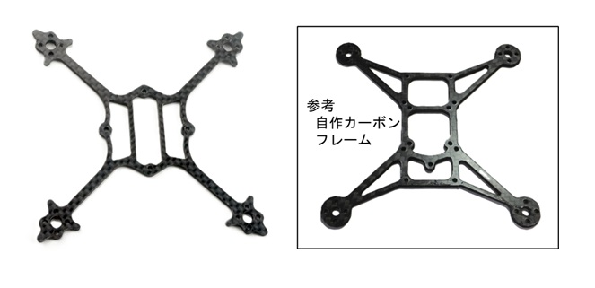 結局、使用した市販のカーボンファイバーフレームは、インターフェース2022年4月号と同じ3インチプロペラ用のHappy Model Crux3 carbon frameにしました。このフレームは、厚さ3mm、対向モータ間の距離が115cmのTrue-X形状のフレームです。重さは5.8gです。
