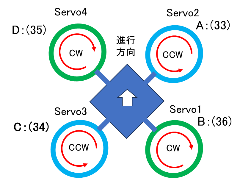 - 振動や異常音が無ければ、RC送信機の右スロットルでピッチとロールをわずかに操作し、操作方向にドローンが追従することを確認する。ピッチの追従方向が逆の場合はRC送信機のピッチ設定が「INVERSE:逆方向」に設定されていない可能性がある。