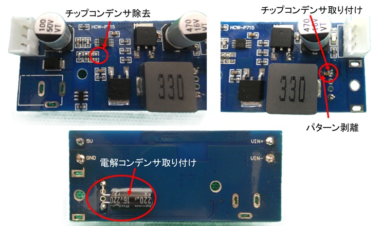 以上の改良を施したボードを以下の写真に示します。電解コンデンサは手持ちの220μFを用いUSBタイプAコネクタを取り除いたスルーホールに取り付けました。もうすこし大きめの容量(470μFぐらい)がよいかもしれません。0.1μFのチップコンデンサは、USBタイプAコネクタの5Vスルーホールとその直近のGNDパターンのレジストを取り除いた部分に取り付けました。ねじ穴は、GNDパターン以外のパターンが無い部分に穴開けしました。