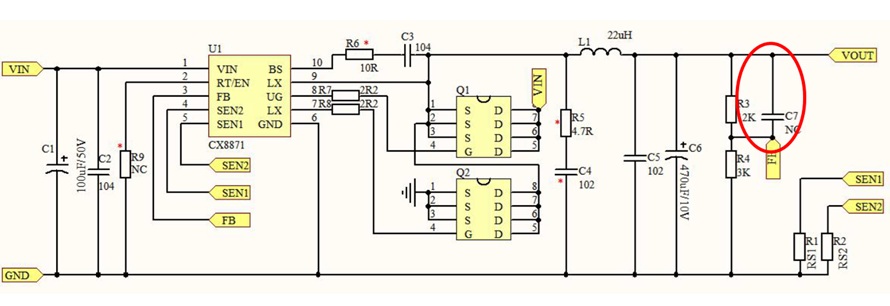 ドローン以外の用途に使おうと、入力に4Sバッテリを接続して負荷抵抗値を変えて実験してみました。その結果、2個ともリップルがあるものの5Vは出ていましたが、1A以下しか流すことができず、1A以上流そうとすると出力に接続されたLEDが間欠的によわよわしく点滅するのでした。このときの出力波形を観測すると間欠的にパルス電圧が出ていました。おそらく何等かの原因で1A以上では保護回路が動作しているものと推測されます。そこで原因を探るため、このボードに搭載されたスイッチングレギュレータIC(型番CX8871A)のデータシートがないかネットで調べてみました。中国深せん市にある会社がこのICの製造元のようでデータシートをダウンロードすることができました。データシートは中国語で書かれていたのですが、アプリーケーション例として以下の回路図が記載されていました。